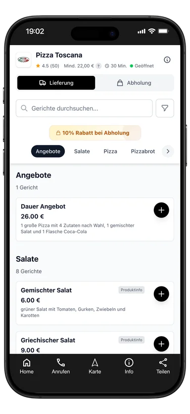 1 große Pizza mit 4 Zutaten nach Wahl, 1 gemischter Salat und 1 Flasche Coca-Cola